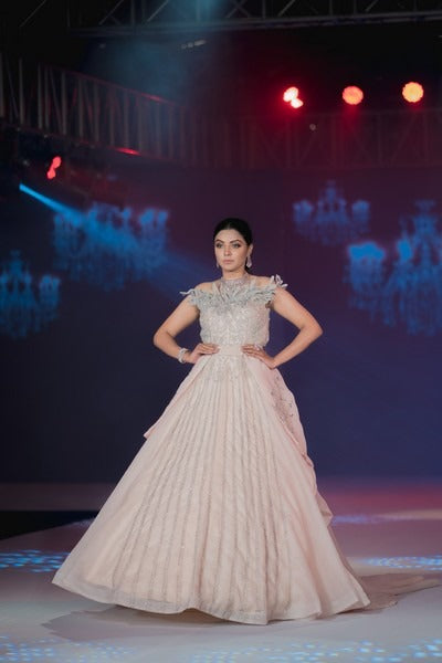 Organza ball gown with appliqué embellishments on the neck and silver hand embroidery all over. It comes with a separate wired skirt and detachable trail.