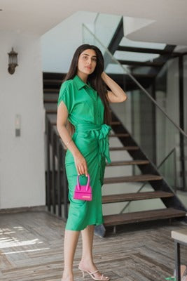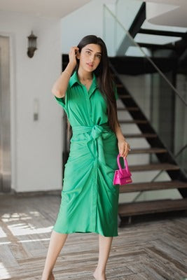 Satin dress with front buttons and tie up knot, loose fit sleeves and collar