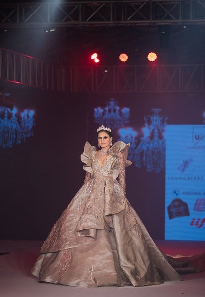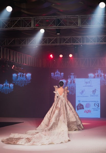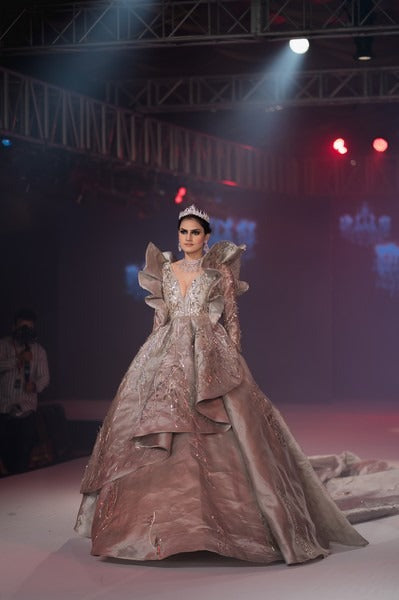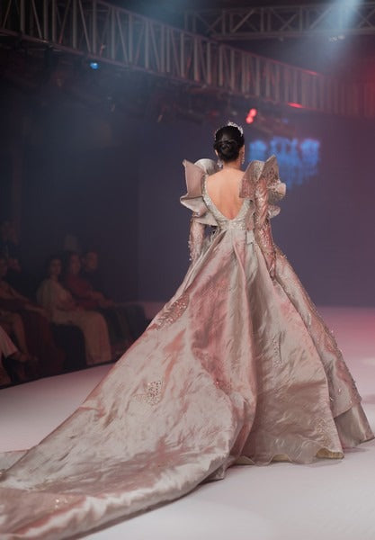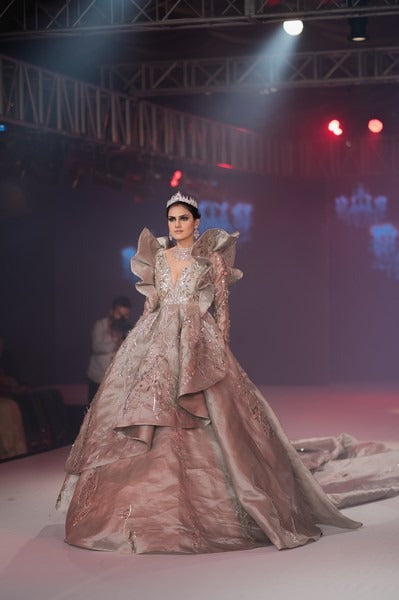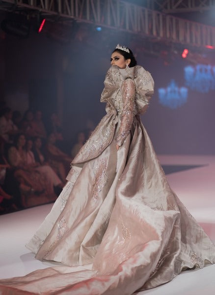 Organza ball gown with hand embroidered detailing, ruffle sleeves and back trail. Comes with a separate ring skirt underneath.