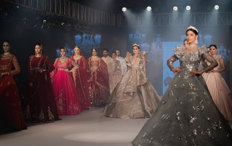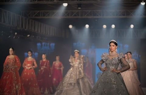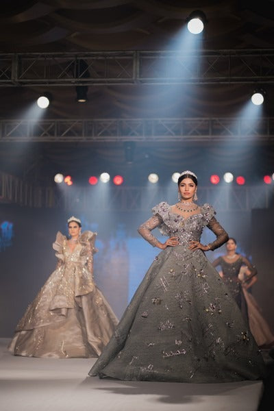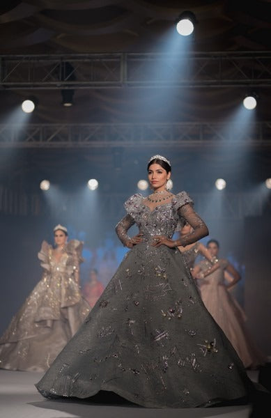 Grey ball gown with full sleeves and raised shoulder detailing. Fully hand embroidered with back trail and separate underneath flares skirt.