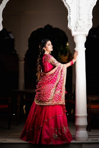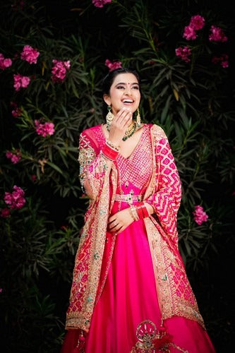 Raw silk Anarkali with sequin, emerald, kat Dana etc. embroidery and a stunning organza jacket with embellished sleeves and detachable belt and bandhej dupatta