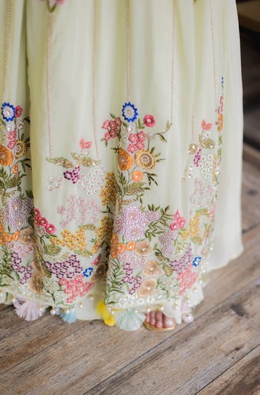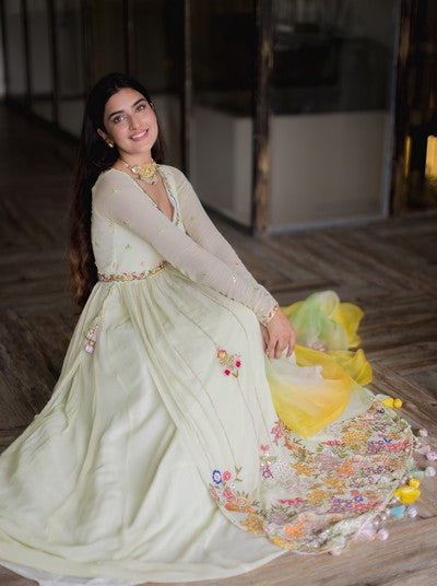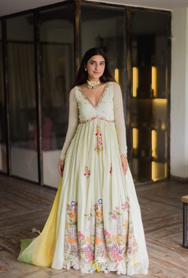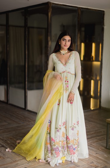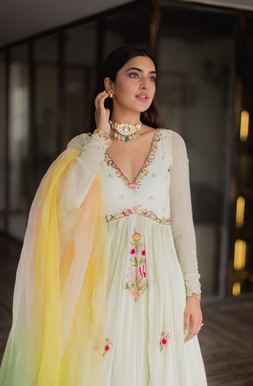 Floor length Anarkali suit with Multi colour thread and hand embroidery on the flaps and bodice. It comes with a light weight pure organza dupatta with tie die effect on it. It has no bottom