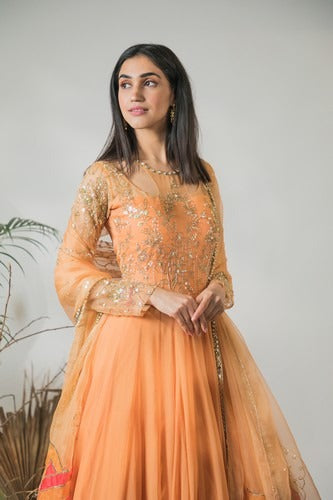 Orange Anarkali in georgette fabric with hand embroidered detailing in kat Dana and sequin.