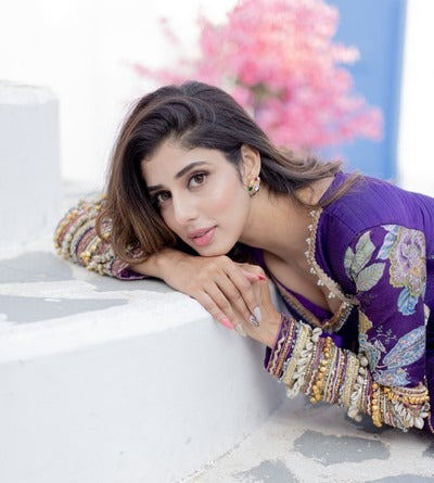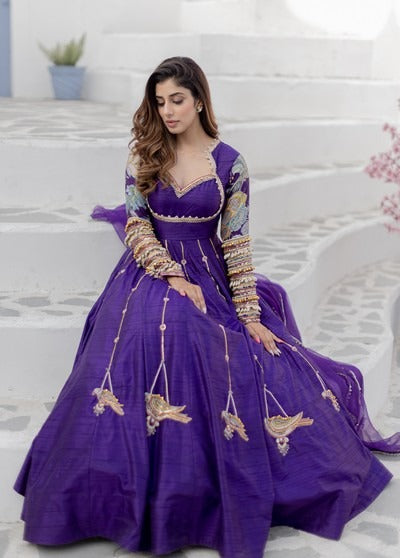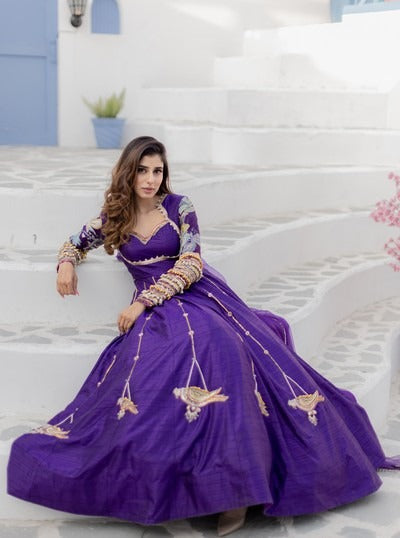 Floor length raw silk Anarkali with floral sleeves heavily hand embroidered with shells, sequin, ghungroo etc. it comes with hand embroidered parrots all over the flare and a pure organza dupatta with four side border.