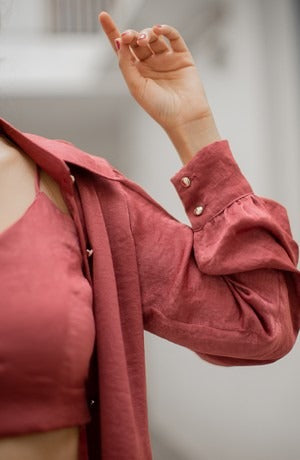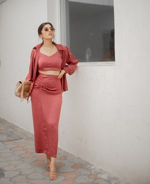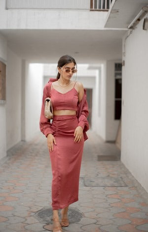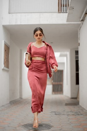 Three piece co-ord set with crop top, pleated skirt and shirt.