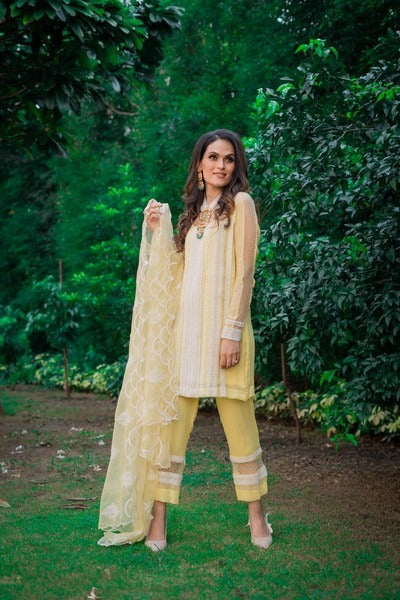 Loose fit short suit with ankle length pants. Thread work on dupatta and appliqué lace detailing on suit and pants.